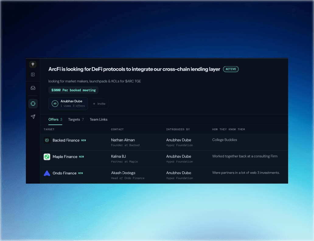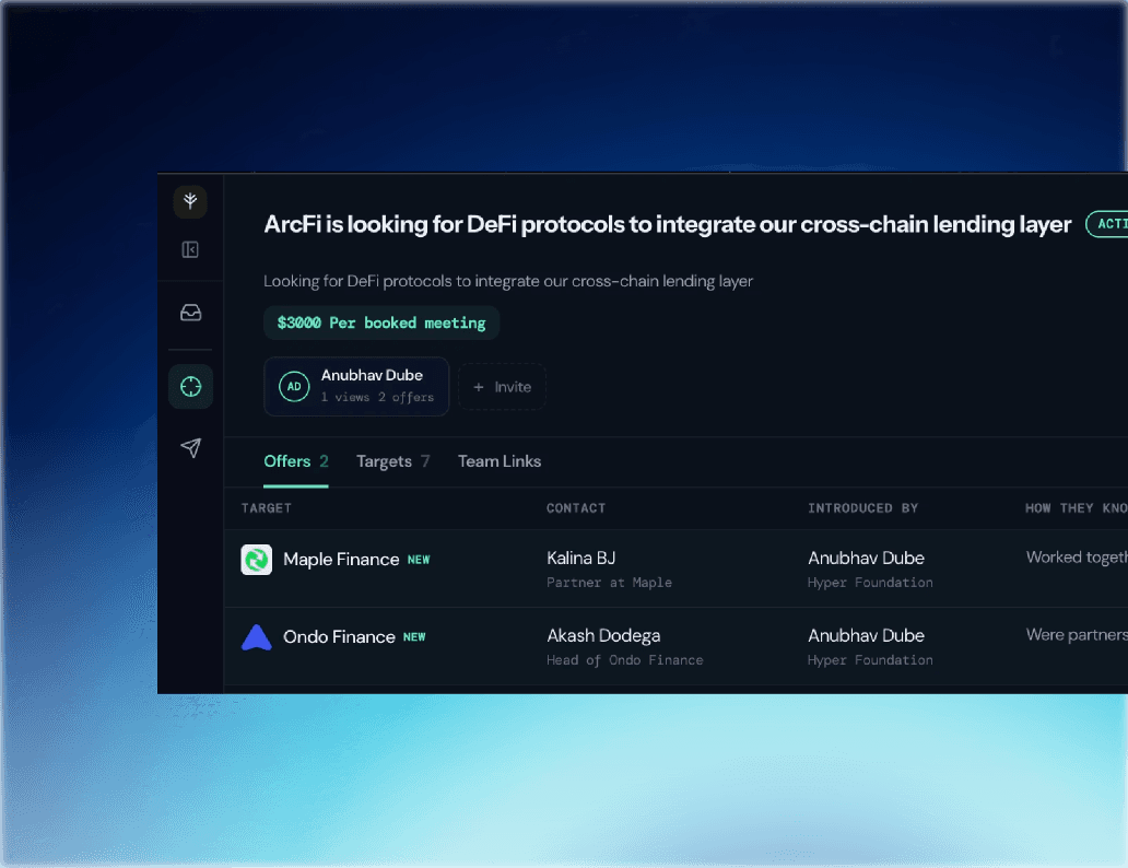 Someone in your network needs a meeting you can make happen. See who they're targeting. Offer an intro in 30 seconds. Earn a bounty or a favour when the meeting books.