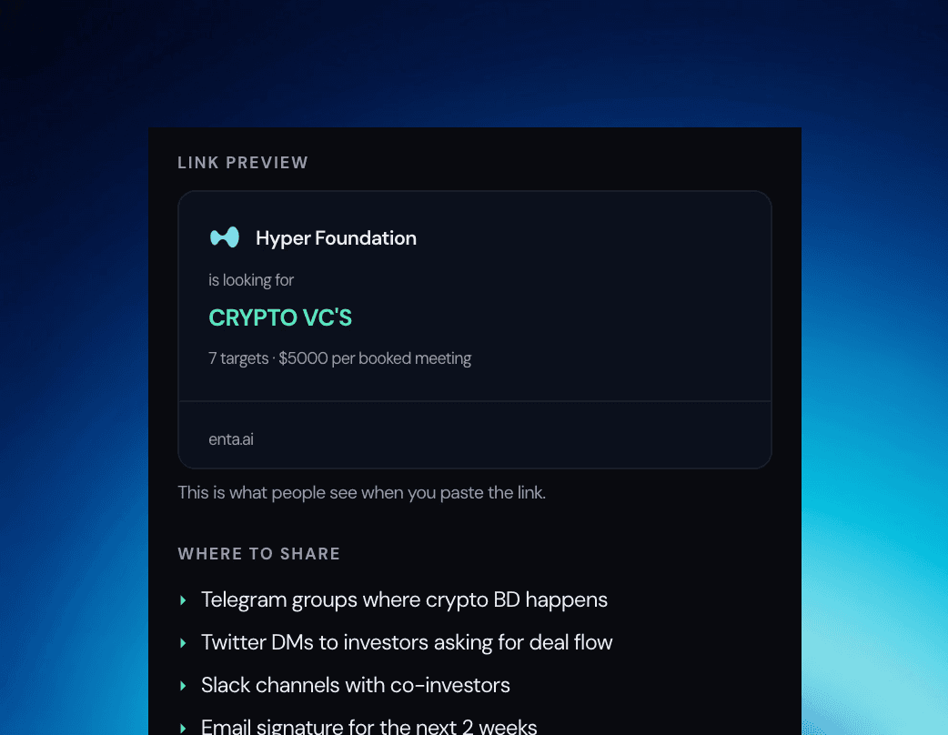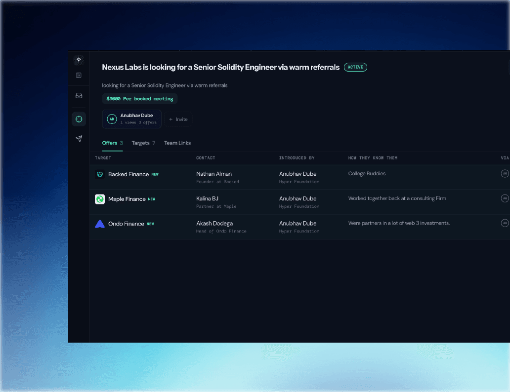 You need meetings with decision makers. Post who you want to meet and why. Share one link with your network. Intro offers land in one dashboard. You pick the strongest path in.